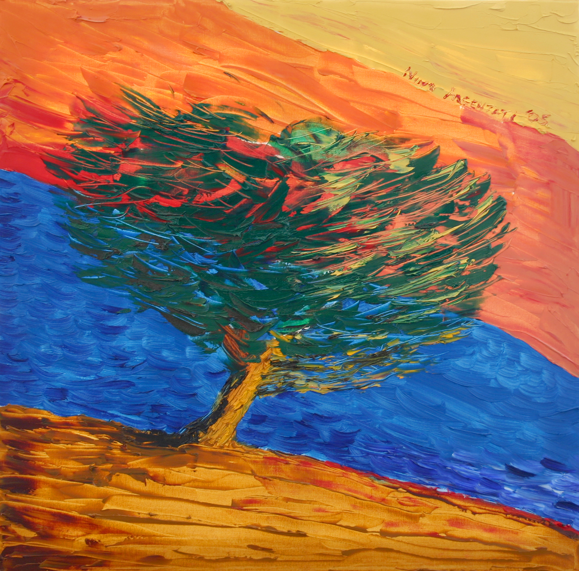 Mediante veloci colpi di spatola ho cercato di creare, nelle fronde dell’albero, un effetto agitato, scosso dal vento.